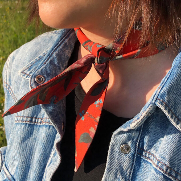 Ogni foularino è confezionato in un packaging in cartone nero, con un cartellino che ne racconta la sua preziosa identità artigianale.
